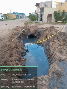 Para a execução do serviço, foi necessária a retirada temporária de canos de 60 cm de diâmetro, possibilitando o desentupimento da rede fluvial, que apresentava obstrução e comprometia o escoamento da água.
