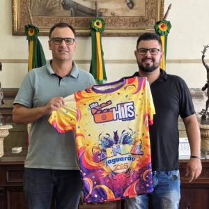 O vice-prefeito de Jaguarão, Jonas Barreiros, recebeu na manhã de hoje (09/02) o diretor Lasier Dias, da Vibe Hits Produções e da Rádio Jaguarão FM 87.9, ocasião em que foi realizada a entrega oficial da camiseta da transmissão do Carnaval 2026.